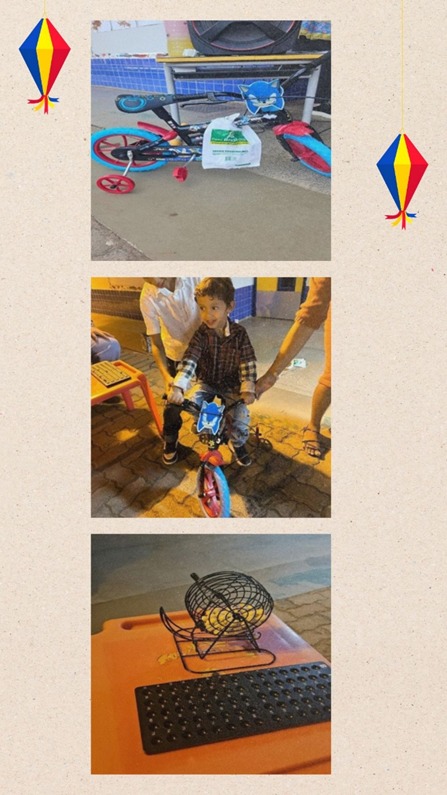 Pensando de forma justa e divertida também, foi feito um bingo para os maiores se divertirem e o prêmio principal  foi uma bicicleta infantil. Muitos participaram e gostaram da brincadeira, que foi uma forma da família e as crianças se interagirem.O ganhador foi o Lorenzo, que já saiu pedalando o seu prêmio.