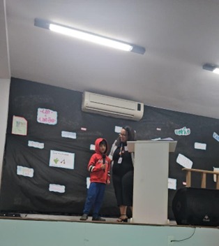 Na sequência da premiação, a cerimônia teve um dos momentos mais emocionantes da tarde. Em um gesto simbólico e participativo, o palco foi aberto ao público com a pergunta: “Quem quer anunciar o próximo vencedor?” Diversas crianças levantaram as mãos, entusiasmadas. Um dos pequenos foi escolhido para subir ao palco e, com a ajuda carinhosa da Thaynara, anunciou diante de todos os presentes o vencedor da categoria Melhor Participação Masculina.