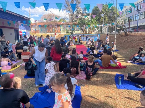 A festa foi organizada em oficinas, com o objetivo de promover interação entre as crianças e seus familiares. Cada turma organizou sua oficina em um espaço da quadra, favorecendo a colaboração, o protagonismo infantil e o sentido de pertencimento. A festa foi enriquecida com um espaço para expressões artísticas com desenhos, pinturas, confecção de bonecos de graveto e pulseira da natureza. Além disso, a festa contou com um momento especial de parabéns aos aniversariantes do trimestre.