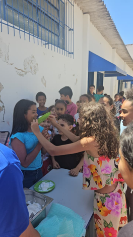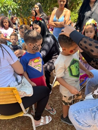 As atividades continuaram com oficinas interativas, como a produção de bolhas de sabão e pinturas faciais, proporcionando momentos de diversão e integração entre famílias, crianças e educadores.