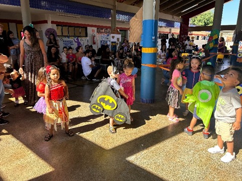 Logo depois, cada turma realizou sua apresentação especial, encantando os familiares com coreografias e performances, preparadas com carinho. A programação seguiu com um desfile das crianças, destacando as fantasias criativas e a participação de todos.