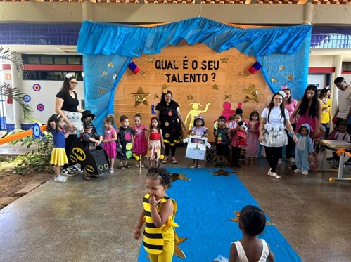 Em seguida, as educadoras subiram ao palco com uma apresentação musical, animando e envolvendo todo o público presente. A festa continuou com o Festival de Talentos, onde crianças inscritas apresentaram números artísticos ao lado de familiares, em momentos de muita alegria e descontração.