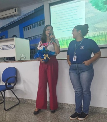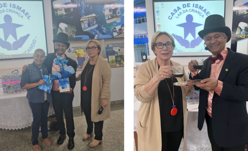 Em um momento de homenagem, Aparecida Camarano convidou a professora Lindelzi O. Dourado, colaboradora do grupo com maior tempo de serviço à Casa, para entregar uma singela lembrança ao palestrante, como símbolo de gratidão e reconhecimento pelo trabalho realizado.