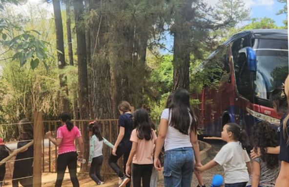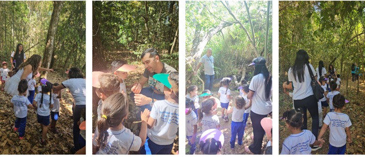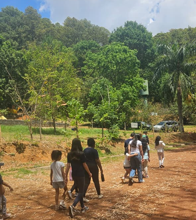 O primeiro momento das atividades foi dedicado à trilha ecológica. Acompanhados pelos guias, os grupos percorreram o espaço e tiveram a oportunidade de conhecer e descobrir diferentes elementos da natureza. A cada parada, novas curiosidades eram apresentadas, despertando o interesse e o encantamento das crianças, que demonstraram entusiasmo durante todo o percurso.