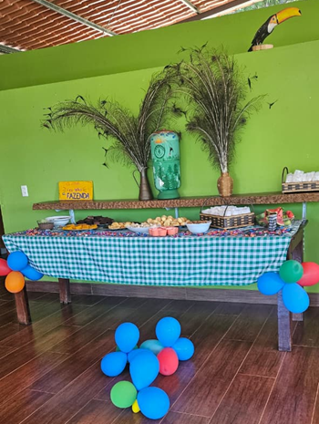 Além do bolo de aniversário, teve outras guloseimas para saborear, entre elas foram: pavê, pipoca, refrigerante e torta de frango.