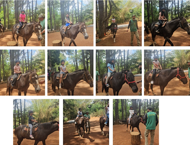 Em seguida, as duplas participaram de um passeio à cavalo, revezando-se para viver a experiência de forma segura e divertida. O momento foi de muita alegria e superação, especialmente para aqueles que montaram pela primeira vez. Além disso, a diversão continuou com o pula-pula, garantindo risadas e energia entre as crianças e adolescentes.