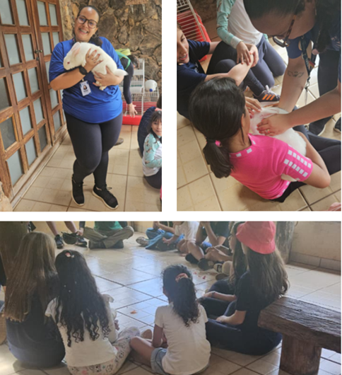 Outro momento especial foi a roda interativa, onde as crianças puderam segurar e interagir com um coelho. A atividade foi conduzida pelo guia local e pela Thaynara Reis, Coordenadora do SCFV, que apresentou o animal e o passou entre as crianças, despertando curiosidade, cuidado e carinho. A simplicidade do momento encantou os pequenos e promoveu uma experiência de contato com a natureza e os animais.