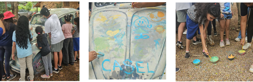 Encerrando a manhã, os participantes se reuniram para uma atividade criativa e colorida: a pintura de um fusca com tintas e desenhos livres. A proposta estimulou a imaginação e o trabalho em equipe, resultando em um momento de descontração e alegria. As crianças se divertiram expressando sua criatividade e celebrando um dia repleto de descobertas e novas experiências.