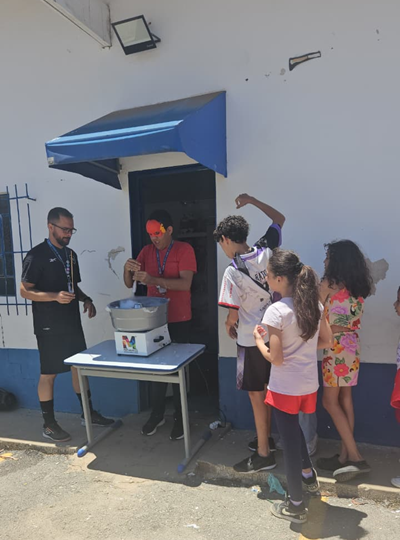 Além disso, a manhã foi repleta de atividades e oficinas: Corrida do saco, troca de brinquedos, roda com as famílias, onde cada participante escolheu um emoji e compartilhou o sentimento do momento e depois todos desenharam em uma grande tela, no chão. Além disso, teve um animado bingo com quatro premiações: um Pix de R$50, uma caixa de chocolates, uma chuteira e até uma galinha viva!