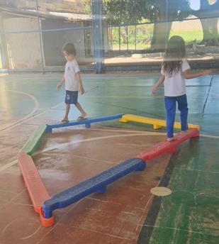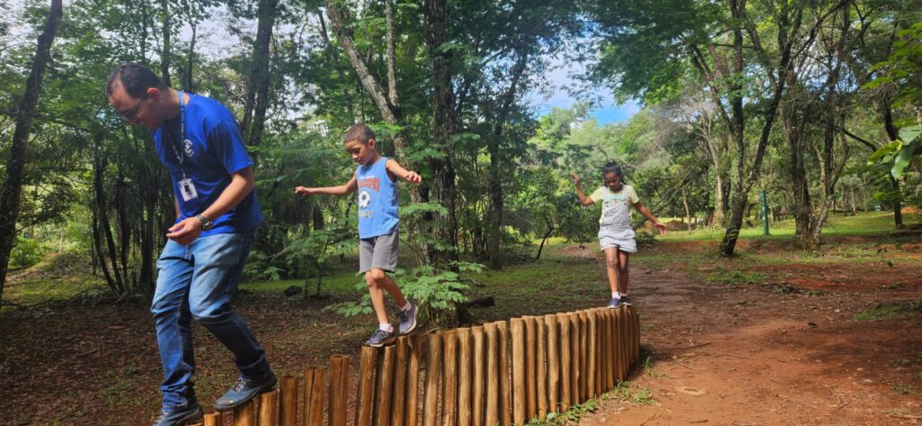 As crianças e adolescentes também realizaram atividades de habilidade, como o percurso entre linhas, no qual precisavam atravessar sem tocá-las, e exercícios de equilíbrio, que consistiam em caminhar sobre madeiras. As dinâmicas foram acompanhadas pelos educadores, que orientaram os conviventes e aproveitaram os momentos para apresentar o espaço e compartilhar conhecimentos de forma educativa e interativa.