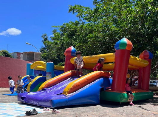 Brincaram em brinquedos infláveis, exploraram o “Faz de Conta” criando suas próprias brincadeiras, houveram brincadeiras com água, pintura de rosto, barangandã e um cardápio delicioso escolhido pelas crianças: uma deliciosa macarronada, dindin, bolo, frutas e cuscuz temperado.