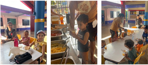 Ao chegarem ao local, as crianças foram recepcionadas com um café da manhã variado, preparado com carinho e composto por: frutas, pão de queijo, sucos, água e balinhas, proporcionando um momento de acolhimento e descontração antes do início das atividades. Após o café, os participantes seguiram para as dinâmicas e brincadeiras programadas, que incentivaram a convivência e a integração.
