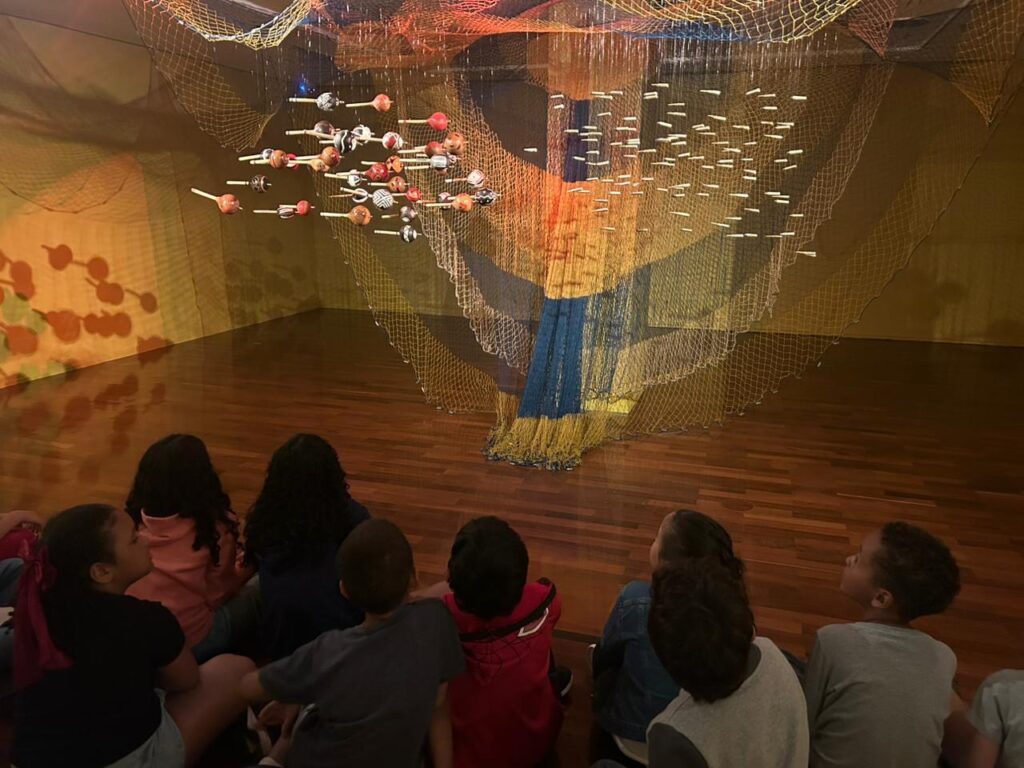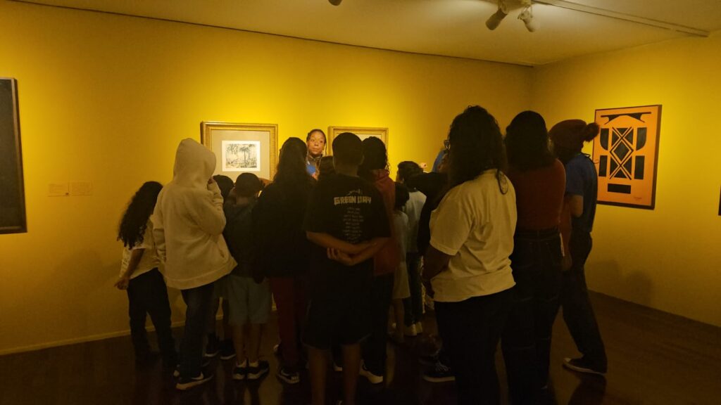 Após as apresentações, todos subiram para conferir a exposição. A Guia responsável pelo acompanhamento da visita, explicou que o artista Ziel pertence à etnia Karapotó e destacou a importância de sua obra como representação da força e da identidade indígena. Durante o percurso, a ela fez perguntas às crianças e adolescentes, incentivando a participação e permitindo que expressassem suas impressões sobre as obras expostas. A interação proporcionou um momento de aprendizado ativo, em que eles puderam refletir sobre a cultura indígena e compartilhar suas percepções de forma espontânea.